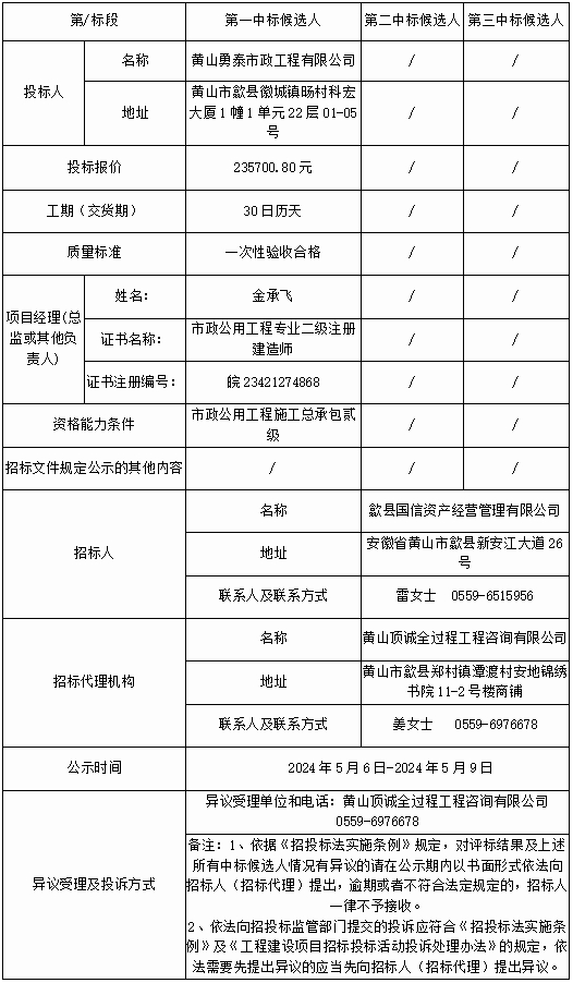 黄山顶诚全过程工程咨询有限公司受歙县国信资产经营管理有限公司的委托,对歙县国信资产经营管理有限公司1号厂房周边环境整治工程进行小型项目招标,本项目于2024年5月6日在黄山顶诚全过程工程咨询有限公司会议室开标、评标,现根据有关法律、法规要求,对中标候选人进行公示。